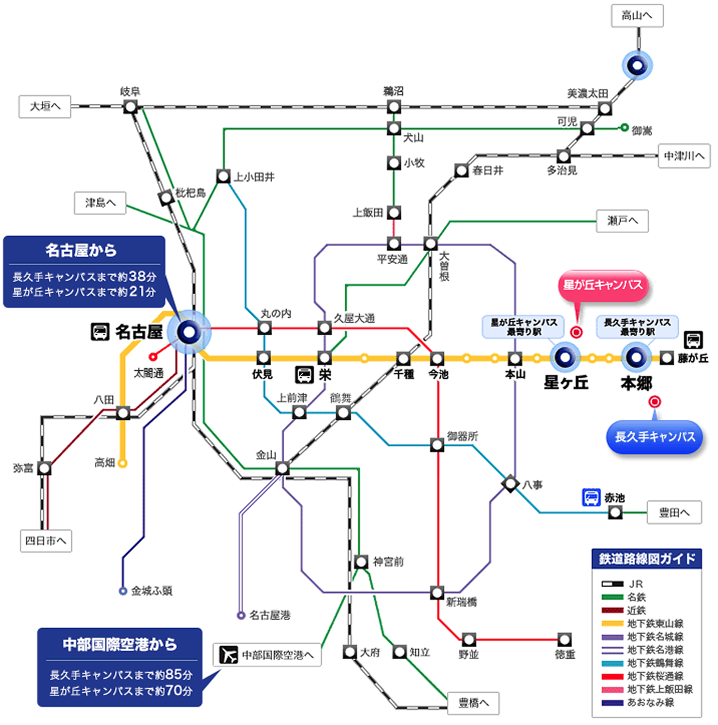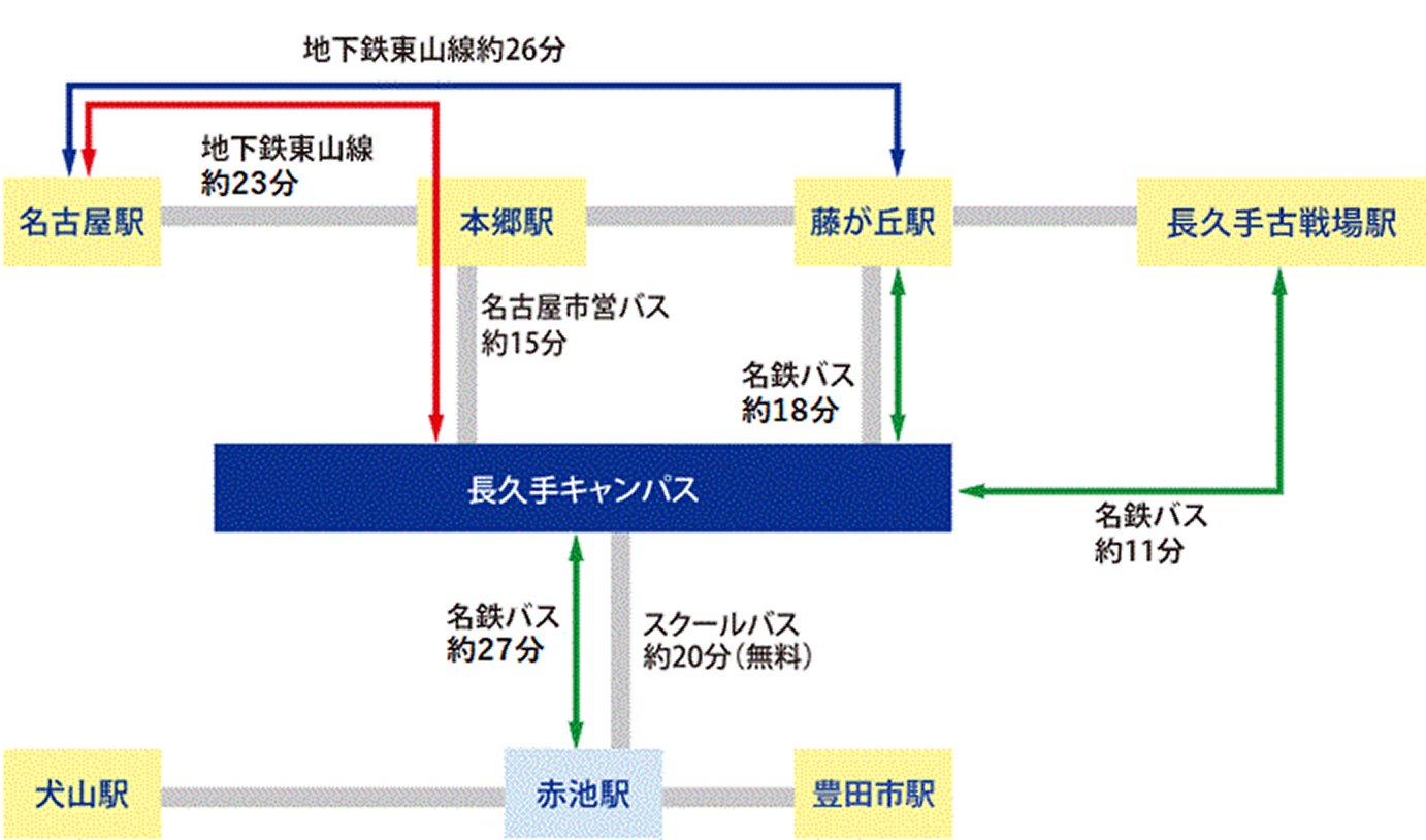 長久手キャンパスや星が丘キャンパスへの交通アクセスについてご紹介します。