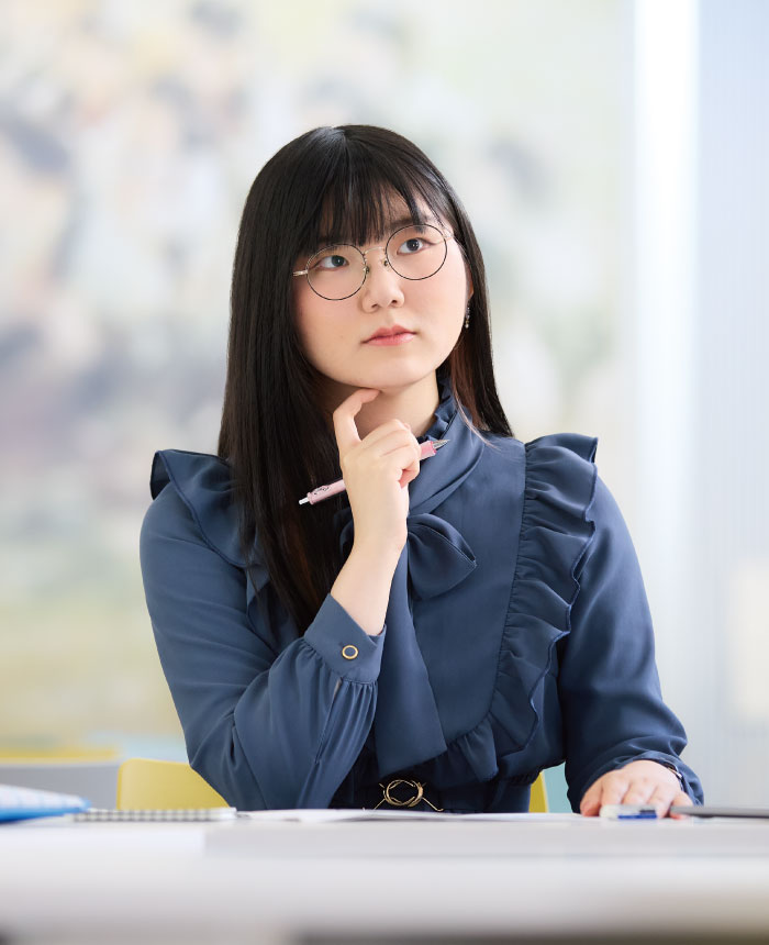 “本や雑誌、広告が好き”そんな思いから興味を持ったメディアプロデュース学科。入学してからは、児童文学や小説、古典作品をはじめ、能や歌舞伎などの伝統文化、CM制作や映画、ウェブでの表現方法と、多種多様な学びに次から次へと興味が広がり――。とにかく勉強が楽しくてしょうがない大学生活。兄の影響で選んだ金融業界も、知れば知るほどに奥深そうだと感じて。4年間で得た表現方法を活かし、相手や場所に合わせた伝え方でたくさんの人に喜んでもらいたい。幅広い知識と話題の“引き出し”は、社会できっと活かせると確信しています。