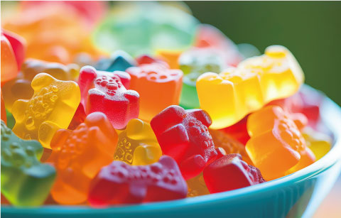 グミのおいしさの要因のひとつに食感があります。クリープメーターを用いてグミを分析することにより、かたさ、粘着性、破断性、凝集性など食感を測定できます。見た目は似ているのに人気のグミは、糖衣がぱりっとし、中はもちっとした食感の変化があって、歯にくっつきにくいものでした。おいしさの特徴を客観的に捉えることができます。