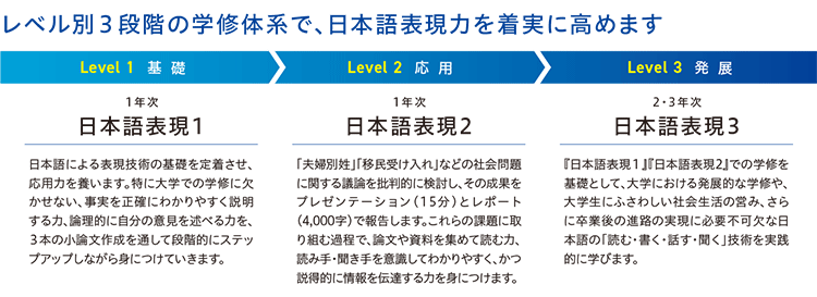 自分の考えをまとめ、意見を正確に伝える日本語運用能力と思考力、コミュニケーション能力を高めるための科目です。基礎から応用、発展へと段階的に学べるカリキュラム編成と、小規模のクラス編成による実践演習が充実。学生の日本語力・学修傾向から分析したオリジナルテキストで効率的に学修し、仕事や人間関係の構築など、あらゆる場面で活かせる日本語運用能力が身につきます。