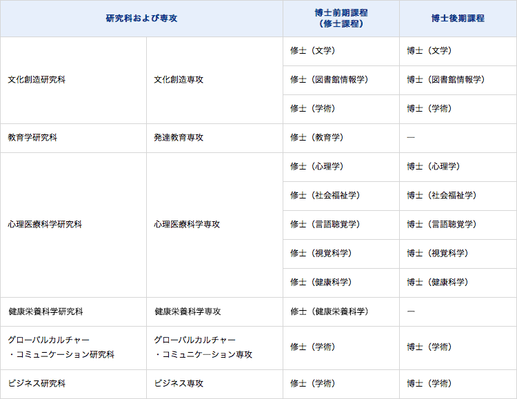 本学大学院の博士前期課程(修士課程)および博士後期課程を修了した者には、次の表に掲げる区分に従い、学位を授与する。