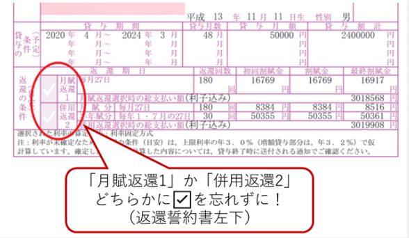 - 貸与奨学金に採用された場合、返還誓約書の大学への提出が必要です(学部・大学院共通)。