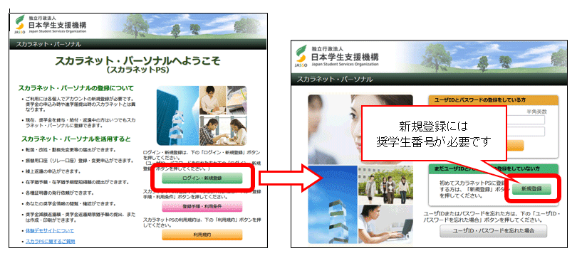 *「スカラネット・パーソナル」は、奨学金申込時にインターネットを通じて入力をおこなった 「スカラネット」とは別のシステムですので、未登録の場合は必ず新規登録をしてください。