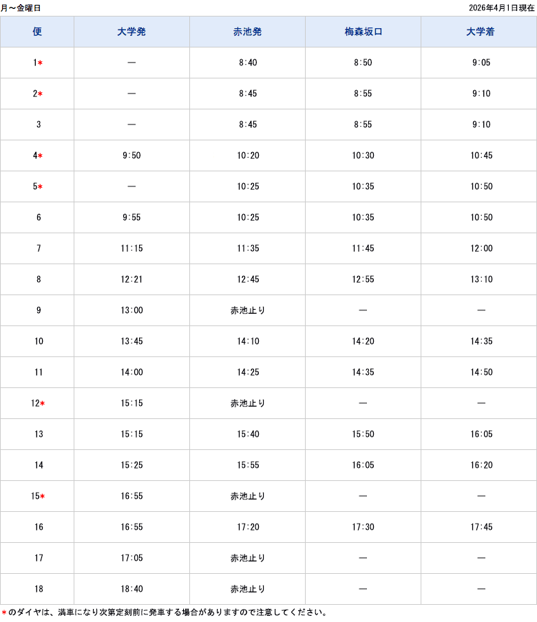 - 乗車の際は、学生証の呈示をお願いします。