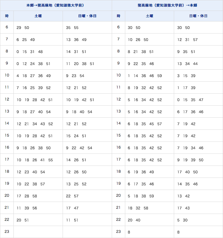 市バス(本郷〜猪高緑地(愛知淑徳大学前)の土、日・休日の時刻表をご紹介します。