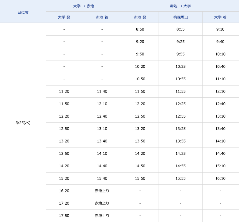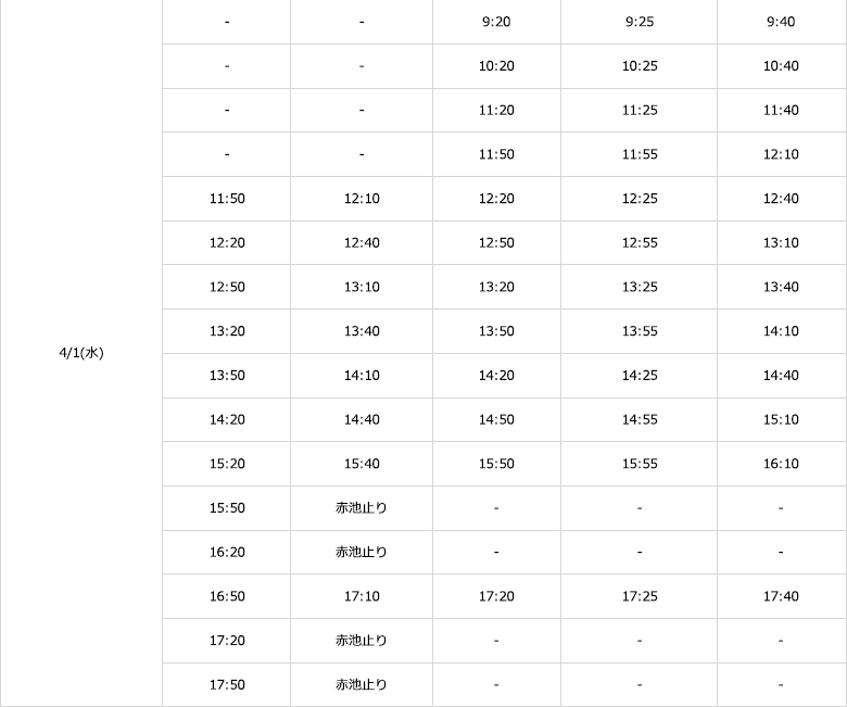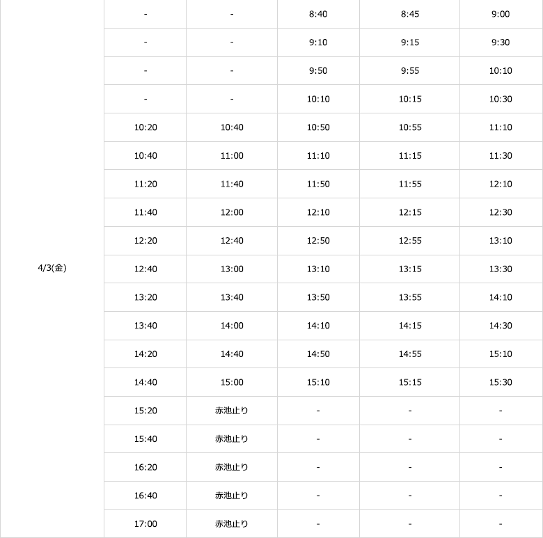 3月25日(水)~4月11日(土)臨時赤池便時刻表