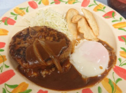 デミグラスソース 温玉添えハンバーグにご飯がすすむ濃厚なソースをかけた人気メニューです。