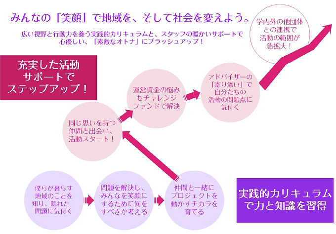 地域とつながるうえで必要となるメールマナー等の一般常識、ボランティア活動の基礎を学ぶ入門科目、グループで課題を解決するためのスキルを高める「企画立案の基礎」、実際に地域とつながり、新しいムーブメントを生み出すプロジェクトなど、多様な科目構成で、実際の活動に役立つスキルを修得します。