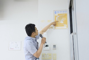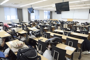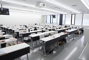 訓練当日は、12時30分に緊急地震速報が発令されたという想定で、学内放送によるアナウンスが流れました。屋内で授業を受けていた学生たちは、速やかに机の下に潜り、退避姿勢を取ります。その後、警戒解除のアナウンスを受けて、教室内で避難場所までの経路を確認しました。退避行動訓練終了後は、「安否確認システム」の運用テストが実施され、災害時の情報伝達の重要性を再認識する機会となりました。