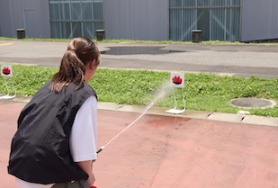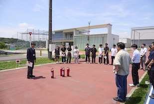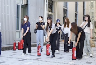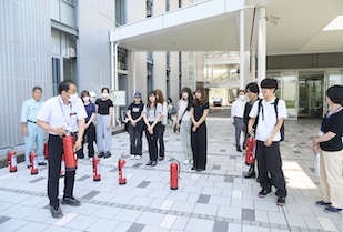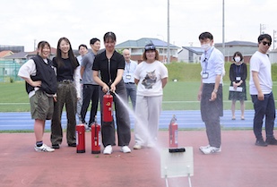 最後に、長久手キャンパスではグラウンド、星が丘キャンパスでは5号館の屋外ラウンジで、消火器の使い方の説明を受け、実際に消火器を使用しながら消化訓練をおこないました。