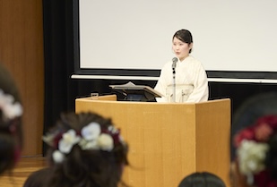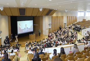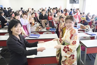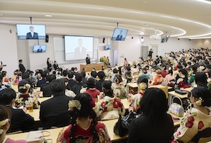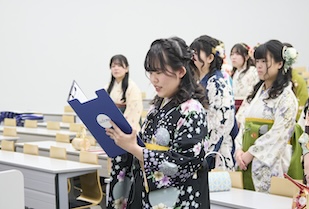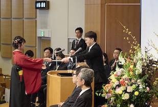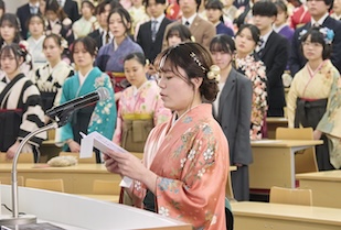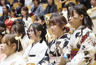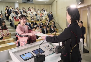 式典では、事前に映像収録された五島幸一学長の式辞、愛知淑徳学園・小林三太郎理事長の祝辞、愛知淑徳大学同窓会・河野豊子会長の祝辞が披露されました。五島学長は「本学で培った『違いを共に生きる』力は、幅広い視野を育て、未来を切り拓く力になります。皆さんは確かな専門性だけでなく、多様な世界をつなぐ力を手にしています」、小林理事長は「相手を理解すること、人とのつながりから学ぶこと、『違い』が新しい価値を生み出すこと。その積み重ねが、皆さん自身の人生を、そして社会を、温かく照らしていくと信じています」、河野会長は「愛知淑徳大学で学んだ自分を信じて前を向き、いろいろなことに果敢に挑み、果敢に挑む自分を大切にしてほしいと思います」といったはなむけの言葉を贈り、卒業生一人ひとりの輝かしい未来を祈念されました。