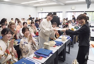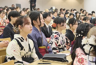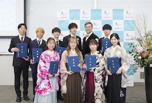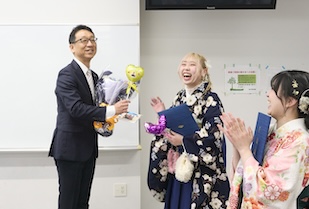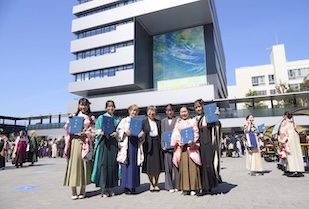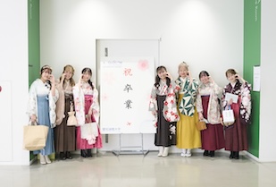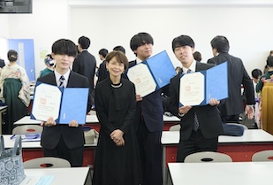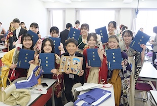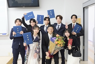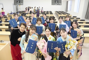 学位記授与では、ゼミの担当教員から学位記が手渡され、卒業生一人ひとりが万感の思いで受け取りました。恩師へ花束や寄せ書きを贈り、記念写真を撮り合い、仲間と語り合う、大学生活を締めくくるひととき。美しい涙やきらめく笑顔に彩られていました。