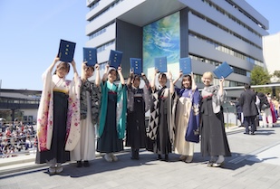 名古屋市で桜の開花が発表された3月17日(火)、令和年7度卒業式が長久手・星が丘両キャンパスで挙行されました。例年会場としてきた名古屋国際会議場が改修工事中のため、昨年度に続き学内での開催となり、学部ごとに時間や教室を分散させて式典や学位記授与がおこなわれました。爽やかな青空が広がり、春の陽気に包まれたこの日、袴やスーツを着た卒業生が慣れ親しんだ学び舎に集まり、晴れやかな門出を迎えました。