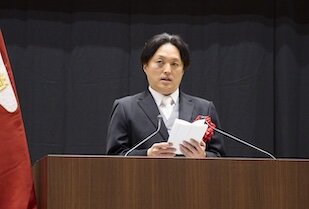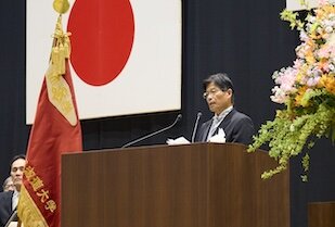 華やかなファンファーレや大学歌により幕を開けた入学式は、厳かな雰囲気のもと進行しました。式辞では五島幸一学長が本学の理念「違いを共に生きる」に触れ、互いの価値観や能力、個性を尊重し合うことの大切さについて語られました。さらに、アメリカ第16代大統領エイブラハム・リンカーンの言葉「I will prepare and some day my chance will come.」を新入生に贈り、「継続的な努力」や「問いを立てる力」の重要性にも言及。「大学では幅広く学び、自ら問いを立てる努力をしてください。皆さんは大学生活を通じて、いろいろな夢を育むでしょう。その実現に何が必要かを考え、行動してください」と新入生一人ひとりが充実した大学生活を送るよう祈念されました。