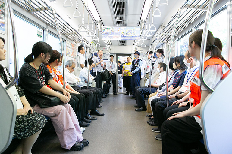 2025年6月18日(水)には、名古屋市交通局日進工場に6つの団体が集まり、合同痴漢対応訓練に取り組みました。集まったのは、愛知警察署、名古屋市交通局、愛知県、名古屋市の4つの団体のほか、他大学の学生数名と、「tASUkeai」メンバーの宮川七海さんと木村眞那さん。訓練は、実際の電車内でおこなわれ、痴漢被害が発生した想定で「誰が、どう動くのか」をシミュレーションする内容です。