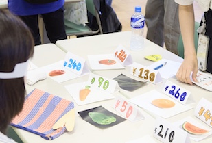「コミュカフェ」は、定期的に近隣の福祉施設を訪問して、高齢者さんと交流を深める活動をおこなっています。ここでは、年齢を重ねると徐々に現れる視覚や触覚の衰えを肌で感じてもらう「お買い物ゲーム」を用意。視界が白くなったり、狭まったりするタイプのメガネをかけて、指定された食材を探し、軍手でお金を探して払うゲームです。「自分のおじいちゃん・おばあちゃんが実際に体感しているかもしれない世界を実感してもらい、自分も将来そうなるかもしれないということも知ってもらいたくて企画しました」と話しました。