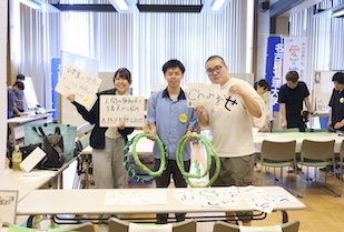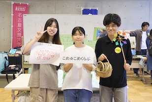 「こめ☆こめくらぶ」は、猪高緑地にある田んぼで、もち米づくりや環境保全活動のお手伝いをしています。今回の出展では、お米に関するクイズを出題し、正解した分だけ輪投げができる遊びを用意しました。参加したお客様は、普段当たり前に食べているお米についての理解を深めながら、輪投げで楽しく遊ぶことができました。学生たちは、「クイズを通して、お米を育てて精米されるまでの過程には、たくさんの工夫や苦労があることを楽しみながら知ってもらえたと思います」と話しました。
