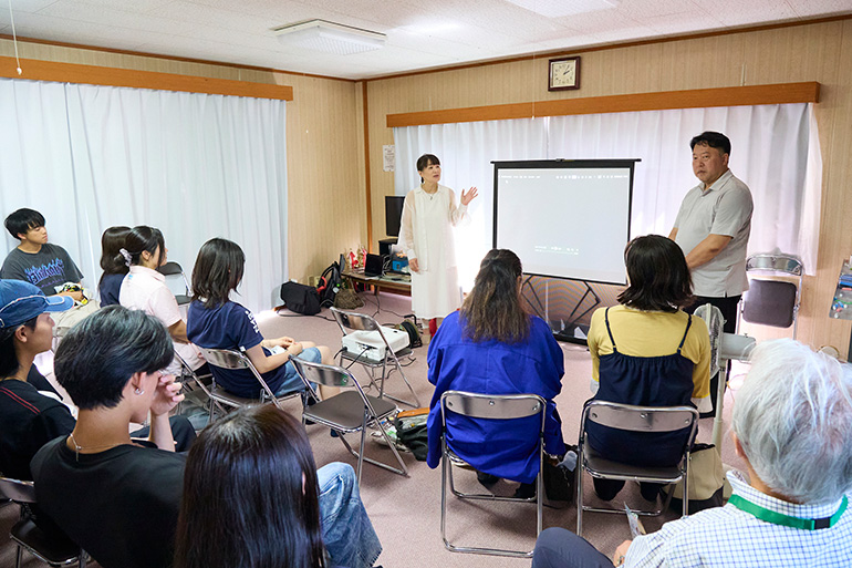 当日はまず、石丸ゼミの学生が制作した映像「長久手人(ながくてびと)」を上映。これは長久手市地域共生推進課の支援を受けて制作したもので、6名の個人と1つの団体に取材を行い、約20分にわたり活動内容や取り組む方たちの想いを紹介しています。