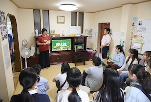 最初に訪れたのは、外国にルーツを持つ子どもたちに日本語教育を通じて居場所づくりをおこなう「NPO法人トルシーダ」の活動拠点・トルカーザです。開会の挨拶はトルシーダ代表の伊東浄江先生が務め、1日がスタートしました。続いて、ブラジル出身のスタッフ・サンドラさんから、ブラジルの文化や歴史、地理についてお話を伺いました。