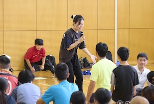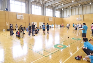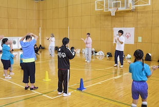 まずは知的障がいのあるアスリートと学生が4つの混合チームに分かれ、それぞれチーム名を決定。その後、学生たちが見本となり、準備運動をおこないました。