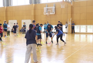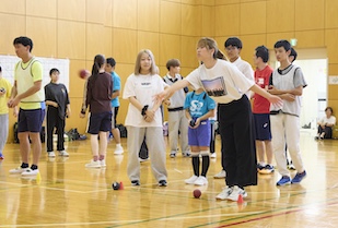 今回の競技は、障がい者スポーツである「ボッチャ」と「フロアボール」の2種目。ボッチャは、白い的球に自分のボールをできるだけ近づけて点数を競う、カーリングに似たスポーツです。得点を重ねると、チーム全体が大きな歓声に包まれ、ハイタッチを交わすなどして大いに盛り上がりました。一方、フロアボールは、スティックでプラスチック製のボールを打ち合い、相手ゴールに入れて得点を競う室内ホッケーの一種です。チームメンバー同士が声を掛け合い、白熱したプレーが繰り広げられました。