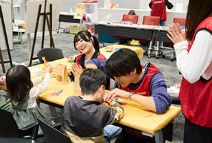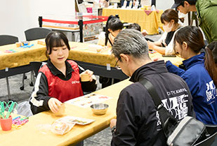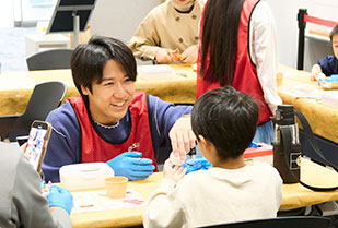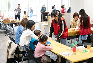 「サステナハニーマルシェ」には、サステナハニーの紹介をはじめ、はちみつ香るグルメ、廃プラスチックを活用した3Dプリンターの造形実演・展示など、さまざまなブースが出展。スタンプラリーやガチャガチャもあり、親子で一緒に楽しめるイベントです。本学のコミュニティ・コラボレーションセンター(以下、CCC)では、学生ボランティアによるサステナハニーを使ったバスボム作りのブースを出展しました。