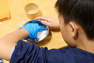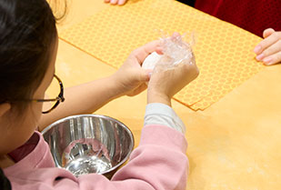 参加した子どもたちは、材料を手で混ぜ、固まり始めると揉み込み、ラップに包んで握り固めていました。真剣な表情を浮かべ、バスボム作りに夢中になっている様子でした。
