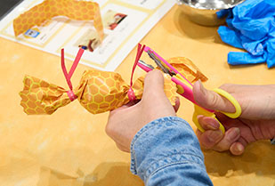 「せっかく作るなら、可愛く持ち帰ってもらおう」と学生ボランティアがアイデアを出し合い、蜂の巣模様の紙や、ギザギザに切れるピンキングハサミなども準備。ラッピングまで完成すると、子どもたちは笑顔でいっぱいに。学生ボランティアにハイタッチを求めて一緒に喜ぶ場面もありました。