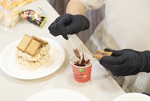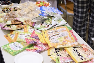 松本ゼミが担当したのは、「AIAインテリアの学校」の初日15時から行われたワークショップです。このワークショップの最大の魅力は、愛知県に本社を置く製菓会社が協賛し、そのお菓子を材料として使ったことです。グリーン豆で有名な春日井製菓様や、しるこサンドの松永製菓様、ポン菓子の家田製菓様といった、愛知でおなじみの企業が協力してくださいました。