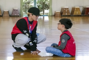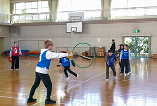 休憩をはさみ、次は各チームで大きな円をつくってドッヂビー。相手の名前を呼んでからソフトディスクを投げ、呼ばれた人はキャッチするのがルールで、お互いの名前を覚えてチーム力を高めます。ほかにも、大中小3つのフラフープの輪を狙ってディスクを投げる競技、次々にパートナーを変えておこなうディスクキャッチなど、児童と学生たちが一緒になって盛り上がりました。