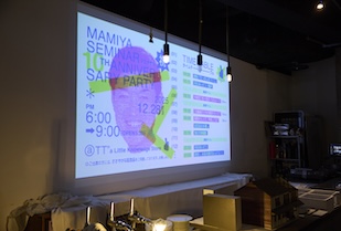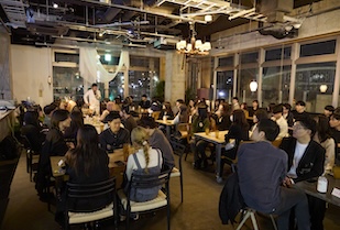 会場は、間宮先生が店舗デザインを手がけた星が丘テラス内のレストラン「TT" a Little Knowledge Store」です。店内にはこれまでゼミで取り組んだプロジェクトの模型やパンフレットが置かれ、彩り鮮やかな食事が並べられました。卒業生50名、現役生20名の約70名が集まり、祝賀ムードいっぱいの中で交流会はスタート。歓談タイムを挟んで、まずは卒業生と間宮先生によるパネルトークを実施しました。卒業生7名を選出し、「今、何してる?」「今だから思う学生時代あ〜しておけばよかった!」「ぶっちゃけ当時の間宮さんどうだった?」など、ざっくばらんなお題を設け、間宮先生を交えてトークを展開。グラフィクデザイナーやユニフォームデザイナー、カメラマン、または設計事務所やデベロッパー、不動産の建築部門など、多岐に渡る分野で活躍する卒業生の話に現役ゼミ生は聞き入っていました。