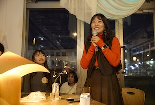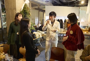 交流会後半には、現役ゼミ生から今の間宮ゼミの活動を紹介するプレゼンテーションがありました。11期生が今期開催した展示会「遡る水展」を紹介し、「海から川へと遡る水のようにありたい」という思いを込めたインスタレーションを展開したと説明。今後の活動予定も紹介し、社会実験イベント等への来場を卒業生に呼びかけました。間宮先生のトークタイムでは、これまで取り組んできたプロジェクトについて振り返り、試行錯誤を繰り返してきた軌跡やマイプロジェクトを進めるために大切なことを学生に伝え、「どんなデザインも、どんなプロジェクトも、必ず人と人との縁の中で立ち上がります。だからこそ、人との出会い、縁を大切にしてほしい。今日の交流会もみんなの出会いと縁の場になればと思っています」と語りかけました。最後は、間宮先生からゼミ生への感謝の言葉が述べられ、交流会はお開きになりました。