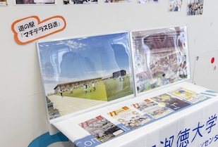 2025年、本学は学園創立120周年、大学開学50周年を迎えました。この記念すべき節目にあたり、本学と連携協定を結ぶ日進市とのこれまでの取り組みの様子や、2025年8月にオープンする「道の駅 マチテラス日進」に関する掲示物などを、星が丘キャンパスで展示しました。