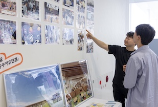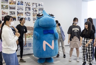 2025年6月27日には、日進市のマスコットキャラクター「ニッシー」が来校。展示を見学する学生は一緒に写真を撮るなど、交流のひとときを楽しみました。参加した学生からは、「今回の展示を通じて日進市との連携事業を始めて知り、長いつながりに驚いた」という声も聞かれました。