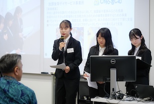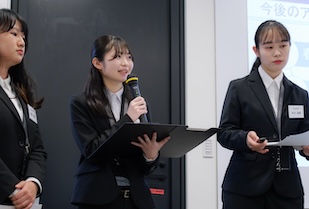 発表後の質疑応答では、「AIをどのように活用したのか、具体的に教えてください」という質問が寄せられました。学生たちは「プロジェクトのPDCAを回す際に思考の補助ツールとして活用し、多角的な視点を得ています。イベント実施後はAIを使って参加者の声から改善点・課題点を抽出し、次のアクションを定めたり、議論の質を高めたりしていきたい」と回答しました。多くの関係者が集まる場で、学生たちは堂々と発表と質疑応答をおこない、プロジェクトの意義やICT・AI活用の現状について参加者と共有しました。