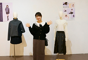 「Mavie」とはフランス語で「私らしさ」という意味で、自分の個性を表現できる秋冬用のファッションアイテムを取り扱っています。入口すぐの壁にはコンセプトビデオが映し出されており、アイテムやコーディネートのポイントを紹介。この動画の撮影・編集は森内さんが担当しており、モデルも服のテーマにマッチする人を自分で手配しました。