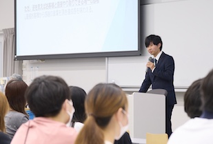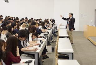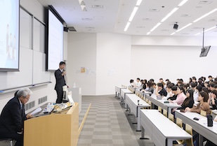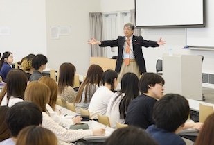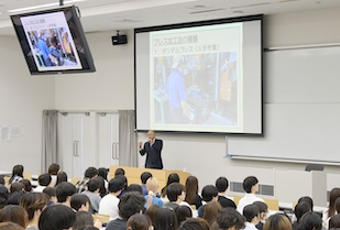 ビジネス学部ではビジネスに関する専門知識や実践的なスキルを身につける科目が多数用意されています。その中でも特徴的なプログラムが3年次に開講される「私のシゴト学」です。さまざまな業界で活躍するプロフェッショナルからその体験談を聴くことで、働くとは何か、仕事に取り組む意義などを学ぶのが目的です。また講義を通じて、就職活動に臨む学生たちの糧にもなると考えています。