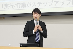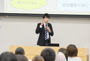 続いて武藤様からは略歴を紹介していただいた後、社会人として必要なことをお話しいただきました。大切なのは「ビジョン、チームワークとコミュニケーション、リフレッシュ」の3点。「ビジョン」は明確であるほど実行力が変わってくるとし、ご自身の「からくりカイゼンコンクール」への挑戦を例に全国大会まで出場した経緯を語っていただきました。「チームワークとコミュニケーション」については、人が運搬していたものを自動搬送化させる計画を例にとり、システム、レイアウト、勤務体系の変更で大変な苦労をされた経験をお話しいただきました。「リフレッシュ」については、心の緩和と強化の両方の観点で、自分がリフレッシュできる方法を見つけると良いとアドバイスしてくださいました。