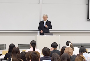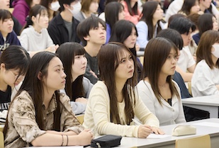 また、昨今の「トランプ関税」を例に出し、これが1985年プラザ合意の再来だと危惧。トランプ関税を回避するために「もし君が日本の製造業の社長だったらどうする?」と学生たちに問いかけます。多くの学生が「アメリカでモノを生産する」と答える中、「それではまた日本が空洞化してしまう」と主張されました。「日本の製品は品質が高いが、その価値をより高く売る視点に欠けているので、ドル立てでモノを高く売るべきではないか。」と述べられ、今回のトランプ関税を機に“良いものを高く売る”という価値観を身に着けるべきではないかと提言されました。