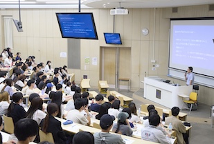 本学では、学生が進路に対する考えを深められるよう、学部ごとにキャリアデザイン科目を設けています。授業では、社会の各分野で活躍している専門家や卒業生を講師としてお招きし、就職活動の進め方や働き方、将来のビジョンの描き方などについて、学生に向けてリアルな声を届けています。