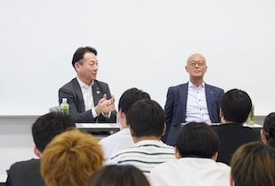 7月11日(金)の授業では、愛知中小企業同友会の事務局次長である池内秀樹様に加え、株式会社トヨコン 明石耕作様、重機商工株式会社 城所真男様、有限会社ノエル 近藤泰子様、株式会社マイゾックス 溝口博己様の4名の経営者の皆様をお招きして、パネルディスカッションを行いました。
