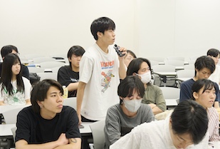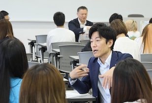 例えば、「就職活動ではどのようにして業界研究をしたらいいですか?」という質問に対しては、株式会社MRT 村田直喜社長が「その会社の事業内容をしっかり調べ、その上で少子化やAI、グローバル化など時代が急激に激変する中で、10年後もその事業が続くかどうかを考えてみるといいと思います。また、その会社が時代にあわせて変化・成長するための取り組みに積極的かどうかも業界研究の見極めるポイントだと思います」とお答えいただきました。また学生団体の幹事長を務める学生には「人は誰についていくのかというと、答えは〝自分の話を聞いてくれる人〟です。だからまずは笑顔で意見を受け入れ、相談しやすい雰囲気をつくってください。社会に出たら仲の良い人だけと仕事するわけではないので、学生時代に苦手な人ともどう付き合うかを考え、経験しておくといいと思います」と話され、学生たちは大きく頷いていました。