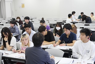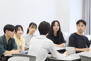 最後に学生たちは「地域の人々の幸福度を上げるために地域の中小企業ができることは?」というレポートテーマが与えられ、レポートを書くにあたり、チームで確認しておきたいことを話し合いました。話し合いにより、「地域に向けて読み聞かせイベントなど開催されているが、地域の人からはどんな声が挙がっている?」「地域の人たちの幸福度はどのような指標で考えたらよいか」などの質問が上がりました。城所様からの回答もふまえて、より深く、地域と中小企業について考える機会となりました。