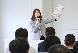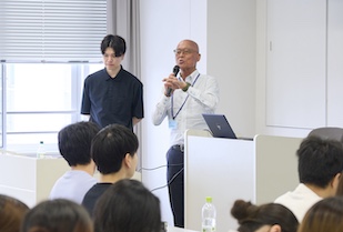 授業の最後には、ビジネス学部の卒業生の近藤海生さんが登壇。近藤さんは現在、愛知中小企業家同友会の事務局員として勤務しており、学生たちに「2025年 愛知同友会インターンシップ」を紹介しました。自身もこのインターンシップに参加したことが愛知中小企業家同友会に入社した大きなきっかけになったと話し、就職活動の際に実際に中小企業で働くことにふれることの大切さを伝えてくれました。