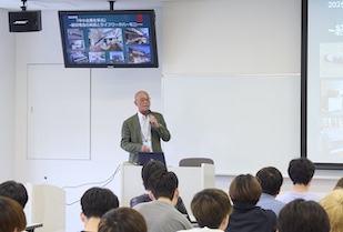 6月20日(金)には重機商工株式会社 代表取締役 城所真男様が来校し、地域における中小企業の役割や、生きる・働く・学ぶにおけるライフワークハーモニーの実現についてお話しくださいました。名古屋市千種区今池にある重機商工株式会社の本社は愛知県で11番目となるZEBの建物であり、省エネ、創エネを考慮した“ゼロエネルギービル”として国土交通省から認定を受けています。屋上の太陽光パネルから蓄電器に送電され、停電しても事務所機能は継続できる仕組みに。また、全館空調システムと個別分散空調が組み合わせられ、寒暖差による健康リスクを回避できるよう考えられています。