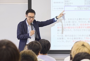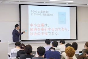講義内容は非常に深く、法や政策といった一聞しただけではわかりづらい内容を学生たちにわかりやすく解説してくださいました。例えば、講義の本題に入る前に、4月から5月上旬に行われた浅井先生の講義を3つの要点にまとめて紹介。中小企業基本法は1963年と1999年に制定されていますが、それについて日本の中小企業政策にはどんな根本理論があったのか、そして63年と99年の制定にはどのような背景があったのかを当時の社会情勢を交えながらお話しされました。