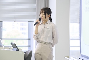 最後に登壇したのは、ビジネス学部の卒業生で、営業部に所属する小柳奈緒佳様。現在の業務内容とそのやりがいについて語られました。特に、同社で初めての女性営業職であることについて、「お客様に安心感を与えやすく、ニーズを引き出しやすい」「業界内では女性営業が珍しく、覚えてもらいやすい」と話され、女性ならではの強みを実感している様子でした。