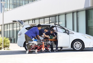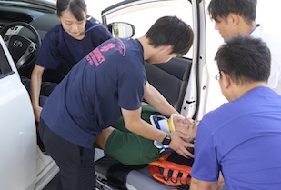 午後からはセンタースクエアに移動し、車外救出の実習が行われました。実際の車両を用い、交通事故などにより自力で車から降りられない傷病者を想定し、観察や処置、脱出を行いました。傷病者の命を守るだけでなく、場合によっては車が引火・爆発する可能性もあり、即時に判断し、素早く処置する難しさも実感しました。