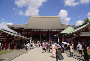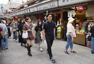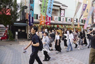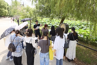 浅草界隈は、谷崎潤一郎の著書『秘密』にも登場することから、学生たちは作品を抜粋した文章を掲載した旅のしおりを手に、縁のある場所を巡り、作品に思いを馳せます。しおりには浅草公園の古地図も載っており、谷崎潤一郎の物語世界をより深くイメージすることができたのではないでしょうか。多くの観光客でにぎわう浅草寺(せんそうじ)や、浅草らしいお店がずらりと並ぶ仲見世通りの観光も楽しみました。