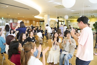 イベントの最後には、SAからグローバルラウンジの紹介がありました。2025年にリニューアルされたラウンジは、より利用しやすくなっています。話したい言語をネックホルダーのタグで色分けしたり、他言語が苦手でも利用しやすい雰囲気づくりや友達づくりのフォロー体制を整えたりと、留学生はもちろん、日本人学生にとっても活気ある交流の場となっています。